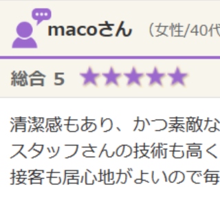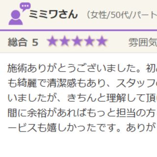 施術ありがとうございました。初めて行かせて頂いたので不安もありましたが、接客にも仕上がりにも大満足です。聞いていたとおり店内も綺麗で清潔感もあり、スタッフの方の接客から全て良かったです。初めてだったので最初のアンケートにもいろんな条件を選択...